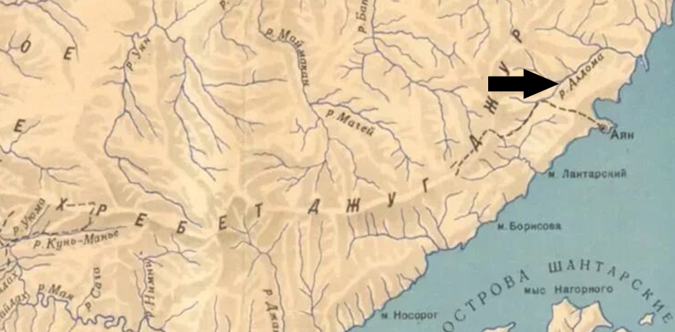 …Дальше путь идёт по реке Алдоме, берущей своё начало в центральной части Джугджурского хребта. Тут совсем другая растительность. Прибрежные горы прикрывают долины от холодных и губительных морских ветров, и это создало деревьям нормальные условия для роста. Мы видели здесь настоящую высокоствольную тайгу Огромные лиственницы,достигающие тридцатипятиметровой высоты, толстенные ели, березы, тополя украшают долину. Они жмутся к реке и растут только на пологих склонах, защищенных от ветра…